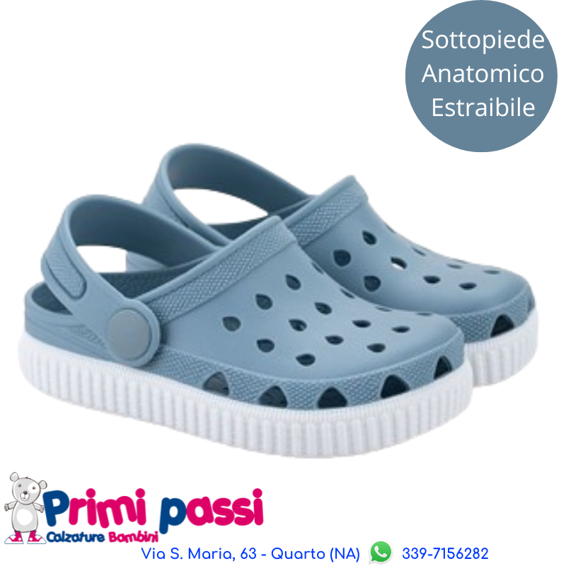 Comodo e pratico sandalo mare in gomma modello tipo Crocs. Ottimo per l'estate e le passeggiate in spiaggia. Perfetto per i primi passi e per i bambini perchè morbido e colorato. La pratica soletta interna assorbe gli urti del piedino durante le passeggiate estive mantenendolo fresco grazie al materiale traspirante. La soletta può essere rimossa all'occorrenza, ad esempio quando si è in spiaggia o in acqua per una flessibilità e una calzabilità comoda.