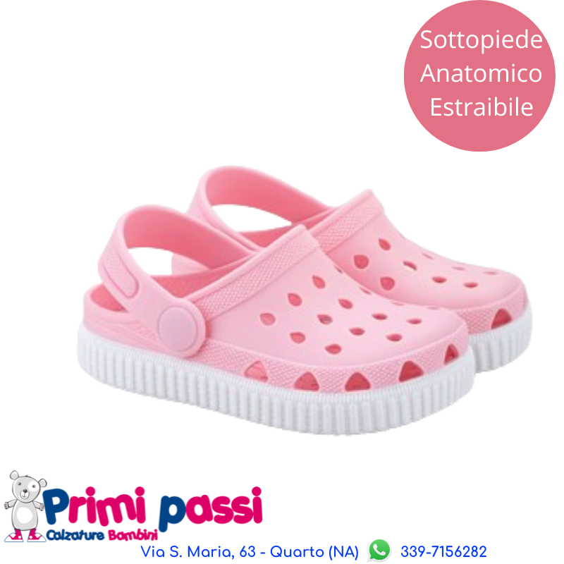 Comodo e pratico sandalo mare in gomma modello tipo Crocs. Ottimo per l'estate e le passeggiate in spiaggia. Perfetto per i primi passi e per i bambini perchè morbido e colorato. La pratica soletta interna assorbe gli urti del piedino durante le passeggiate estive mantenendolo fresco grazie al materiale traspirante. La soletta può essere rimossa all'occorrenza, ad esempio quando si è in spiaggia o in acqua per una flessibilità e una calzabilità comoda.